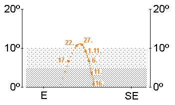 stand am 8. Oktober in Konjunktion mit der Sonne und gewinnt nur langsam an Abstand zu unserem Tagesgestirn. Daher dürfte er erst in der letzten Novemberwoche am Morgenhimmel gegen 7:00 MEZ tief über dem Südosthorizont erkennbar werden. Allerdings passiert Merkur den 1.6m hellen roten Planeten am 10. November in nur 1.1° nördlichem Abstand, so dass man bereits an diesem Morgen einen Versuch unternehmen kann, Mars neben dem wesentlich helleren Merkur in einem Fernglas auszumachen (Diagramm im Abschnitt Merkur).