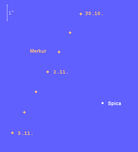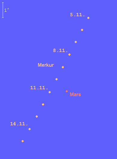 ist während der ersten Novemberdekade am Morgenhimmel sichtbar. Am 1. November passiert der –0.8m helle Planet den Stern Spica in 5° nördlichem Abstand. Diese Konstellation ist gegen 6:30 MEZ über dem südöstlichen Horizont am besten zu erkennen. Bis zum 10. November verlagert sich die beste Beobachtungszeit des dann –0.9m hellen Planeten auf 7:00 MEZ. An diesem Tag steht Merkur nur 1.1° nördlich von Mars, doch ist dieser über 2 Größenklassen schwächer, so dass es schwierig sein wird, diese Konjunktion zu erkennen. Nach dem 10. November werden nur noch Spezialisten den flinken Planeten für einige weitere Tage ausmachen können.