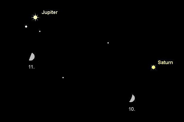 ist ein Planet am Abendhimmel, dessen teleskopische Beobachtungsperiode im November endet. Der 0.7m helle Ringplanet bewegt sich rechtläufig durch das Sternbild Steinbock. Sein Untergang verlagert sich im Monatsverlauf von 22:30 MEZ auf 20:45 MEZ. Der Äquatordurchmesser des elliptischen Scheibchens misst 16.4“, der des Rings 37.0x12.2“. Außer der Saturnkugel und dem Saturnring kann man sich an der Beobachtung der fünf hellsten Saturnmonde versuchen. Am Abend des 10. Oktober steht der Mond 5° unterhalb des Ringplaneten.