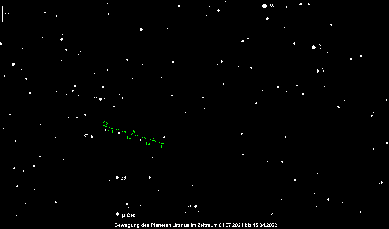 steht am 5. November in Opposition zur Sonne. Der 5.6m helle grünliche Planet ist ein einfaches Fernglasobjekt im Sternbild Widder, und kann unter dunklem Himmel sogar mit dem bloßen Auge ausgemacht werden. Allerdings stehen keine markanten Sterne in seiner Nähe. Uranus geht am Oppositionstag bei Sonnenuntergang auf und bei Sonnenaufgang unter, ist somit die ganze Nacht hindurch beobachtbar. Im Teleskop kann das 3.7“ große Scheibchen ab 100x ausgemacht werden. Mit Instrumenten ab etwa 25cm Öffnung können auch die Monde Titania (13.9m) und Oberon (14.1m) gesichtet werden. Am 18. November steht der Vollmond 2° unterhalb des grünlichen Planeten, doch dürfte diese Konstellation selbst im Fernglas schwierig zu beobachten sein.