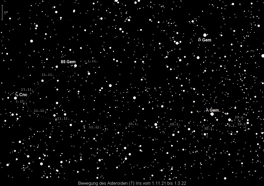 wird im November ein Fernglasobjekt. Kleinplanet Nr. 7 wird am 30. November stationär und bewegt sich anschließend rückläufig im Grenzbereich der Sternbilder Krebs/Zwillinge. Ihre Helligkeit steigt von 9.1m auf 8.5m an. Ihre Kulmination verlagert sich von 5:30 MEZ auf 4:00 MEZ, doch kann sie bereits ab Mitternacht beobachtet werden.