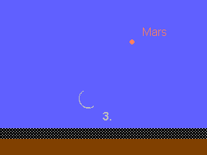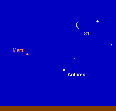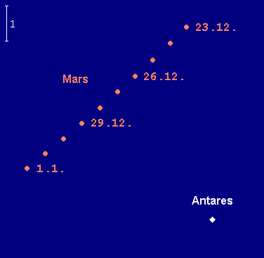 wird am Morgenhimmel auch mit bloßem Auge sichtbar. Am 3. Dezember kann die schmale Mondsichel eventuell eine Hilfe sein. Sie steht 3.5° links unterhalb des Mars, allerdings sehr horizontnah. Die beste Beobachtungszeit ergibt sich gegen 7:00 MEZ, wenn der rote Planet knapp über dem südöstlichen Horizont steht. Mars wandert durch das Sternbild Waage und tritt am 15. Dezember in den Skorpion, dessen Hauptstern Antares er am 26. Dezember in 5° nördlichem Abstand passiert. Diese nicht einfach zu erkennende Konjunktion kann gegen 7:30 MEZ beobachtet werden. Bereits am 24. Dezember tritt er in das Sternbild Schlangenträger. Am letzten Morgen des Jahres steht die schmale Mondsichel 8° rechts oberhalb des roten Planeten.