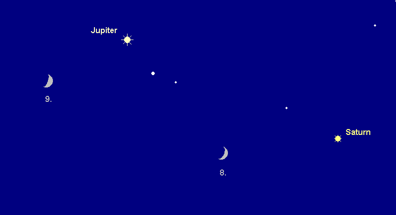 ist ein auffälliges Objekt am früheren Abendhimmel. Er bewegt sich rechtläufig durch das Sternbild Steinbock und wechselt am 14. Dezember in das Sternbild Wassermann. Seine Helligkeit geht von –2.3m auf –2.1m zurück, der Äquatordurchmesser von 38.4“ auf 35.5“. Die Untergänge des größten Planeten unseres Sonnensystems verlagern sich von 22:15 MEZ zu Monatsbeginn auf 20:45 MEZ zum Jahresende. Somit sollte man teleskopische Beobachtungen gleich nach Dämmerungsende durchführen. Am 9. Dezember findet man die Mondsichel 6° links unterhalb von Jupiter.