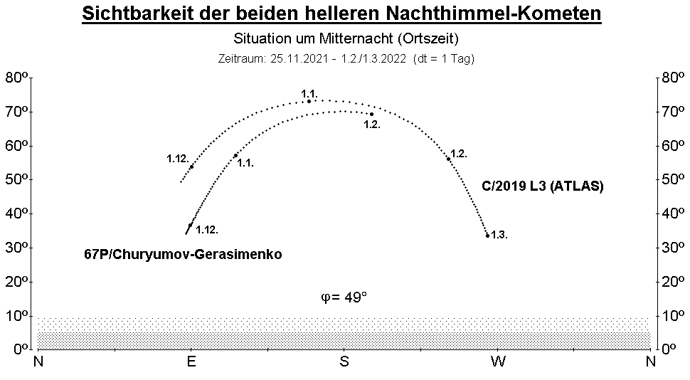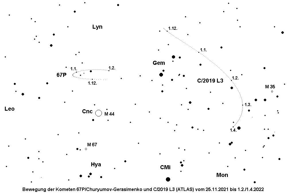 In den nächsten Wochen können der recht entfernte Komet C/2019 L3 (ATLAS) und der von der europäischen Kometensonde Rosetta detailliert untersuchte Komet 67P/Churyumov-Gerasimenko praktisch die ganze Nacht über mit kleineren Teleskopen beobachtet werden. Aktuell sind beide etwa 9m hell (Details finden sich im AVKa-Beobachterinfo Nr. 9).