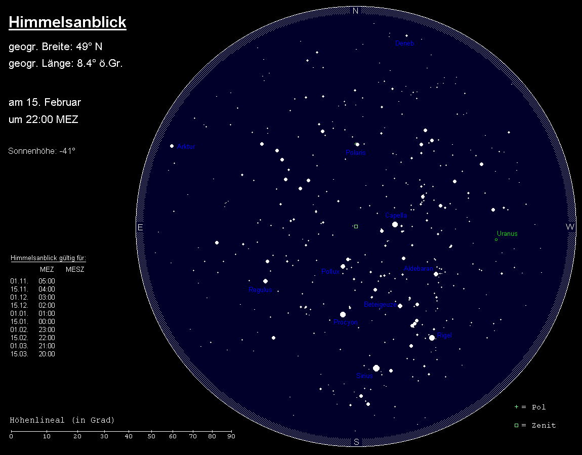 ist ein im Fernglas einfaches Objekt am Abendhimmel. Der 5.8m helle Planet bewegt sich rechtläufig durch das Sternbild Widder und geht anfangs um 1:15 MEZ, am Monatsende um 23:30 MEZ unter. Etwa eine Stunde zuvor verschwindet der Planet im horizontnahen Dunst. Der Mond passiert den grünlichen Planeten am späten Abend des 7. Februar in nur 1.5° südlichem Abstand. Noch kann Uranus sinnvoll im Teleskop beobachtet werden, sofern die Beobachtung gleich nach dem Dämmerungsende durchgeführt wird. Der Planet weist ein 3.5“ großes Scheibchen auf, auf dem auch mit großen Amateurinstrumenten keine Details erkennbar sind.