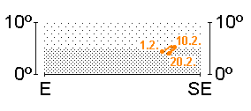 erreicht am 16. Februar seine größte westliche Elongation zur Sonne, die mit 26,3° sehr groß ausfällt. Da aber die morgendliche Ekliptik im Februar nur einen flachen Winkel zum Horizont bildet, wird es nicht einfach sein, den flinken Planeten zu finden. Erstmals kann man am 2. Februar versuchen, den dann erst 0.9m hellen Planeten gegen 7:30 MEZ knapp über dem südöstlichen Horizont zu erspähen. Bis zum 10. Februar nehmen die Horizonthöhen leicht zu, danach sinkt Merkur wieder dem Horizont entgegen. Daher dürfte er, trotz stetig zunehmender Helligkeit, um den 20. Februar (0.0m hell) in der immer heller werdenden Dämmerung unsichtbar werden. Die beste Beobachtungszeit ergibt sich an diesem Tag gegen 7:00 MEZ. Die helle Venus kann eventuell eine Hilfe sein. Sie befindet sich zu Sichtbarkeitsbeginn 13° rechts oberhalb des Merkurs.