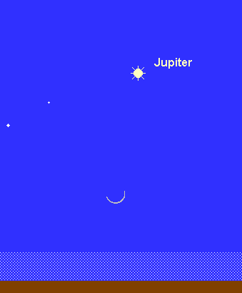 verschwindet in der letzten Februarwoche vom Abendhimmel. Bis etwa zur Monatsmitte wird der –2.1m helle, im Sternbild Wassermann positionierte, Riesenplanet in der Dämmerung noch halbwegs gut erkennbar sein, danach wird er zu einem schwierigen Objekt. Die Untergangszeit verschiebt sich von 19:30 MEZ auf 18:15 MEZ. Am 2. Februar steht die schmale Mondsichel 6.5° unterhalb von Jupiter.