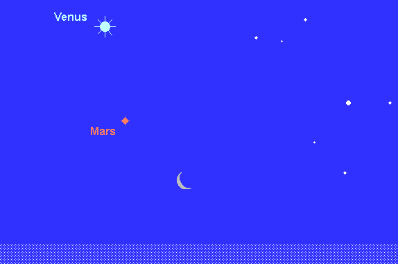 ist strahlender Morgenstern im Sternbild Schütze. Sie weist im Februar ihre größten Horizonthöhen auf und erreicht am 12. Februar mit –4.9m ihre größte Helligkeit während der aktuellen Morgensichtbarkeit. Ihr Aufgang verschiebt sich von 5:45 MEZ am Monatsbeginn auf 5:00 MEZ zum Monatsende. Am Morgen des 13. Februar passiert Venus den noch immer unauffälligen Mars in 6.6° nördlichem Abstand. Am Morgen des 27. Februar findet man die Mondsichel 9° unterhalb der Venus. Im Teleskop weist die Venus noch eine recht große Sichelgestalt auf. Das Venusscheibchen misst am Monatsbeginn 49“ bei einem Beleuchtungsgrad von 15%, am Tag des größten Glanzes gelten 41“ und 25% und am Monatsende ist das 32“ große Scheibchen zu 37% beleuchtet.