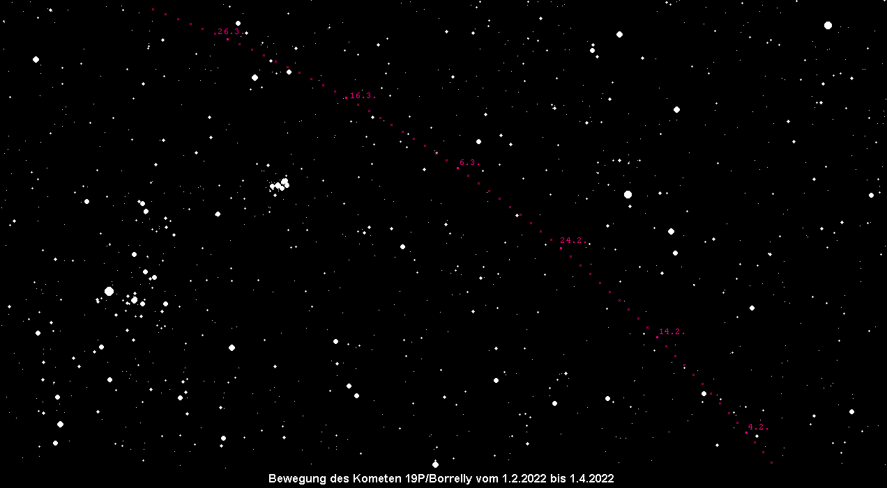 In den nächsten Wochen kann der Komet 19P/Borrelly mit kleineren Instrumenten am Abendhimmel beobachtet werden. Aktuell 8.5m hell wird seine Helligkeit langsam zurückgehen (Details finden sich im AVKa-Beobachterinfo Nr. 10).