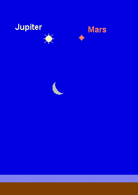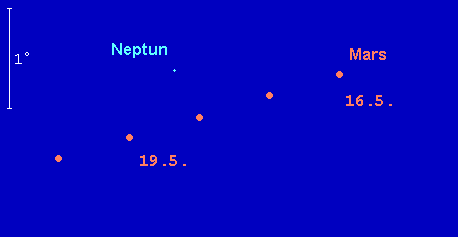 gewinnt diesen Monat etwas an Horizonthöhe. Da seine Helligkeit gleichzeitig von 0.9m auf 0.7m ansteigt, wird er zu einem auffälligeren Objekt. Er bewegt sich zunächst durch das Sternbild Wassermann und wechselt am 19. Mai ins Sternbild Fische. Seine Aufgänge verfrühen sich von 4:30 MESZ auf 3:15 MESZ. Mars nähert sich Jupiter, den er am 29. Mai in 0.6° südlichem Abstand passiert. Zuvor können sich Spezialisten an der Passage des schwachen Neptuns versuchen. Diesen passiert Mars am 18. Mai in 0.6° südlichem Abstand, was eventuell in einem Teleskop ausgemacht werden kann. Am 25. Mai findet man die Mondsichel 4° unterhalb des Roten Planeten (und gleichzeitig unterhalb Jupiters). Im Teleskop können auf dem nur 6“ großen Scheibchen noch keine Details ausgemacht werden.