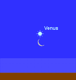 erreicht zu Monatsbeginn die tiefste Stellung über dem östlichen Horizont, sofern ihre Stellung jeweils zur gleichen Dämmerungsphase betrachtet wird. Bis zum Monatsende hat sie wieder etwas an Horizonthöhe gewonnen. Sie bewegt sich durch das Sternbild Fische, wobei sie kurz in das Sternbild Walfisch eindringt und am letzten Tag des Monats das Sternbild Widder erreicht. Ihre Aufgänge verlagern sich von 4:45 MESZ auf 4:00 MESZ, ihre Helligkeit geht dabei leicht von –4.1m auf –4.0m zurück. Am Morgen des 1. Mai findet man nur 0.3° oberhalb der Venus den Planeten Jupiter. Diese schöne Konjunktion kann ab 5:15 MESZ tief über dem östlichen Horizont gesichtet werden. Am 27. Mai steht die schmale Mondsichel nur 1° unterhalb der Venus, was gegen 4:45 MESZ beobachtet werden kann. Im Teleskop kann das stetig kleiner und voller werdende Planetenscheibchen betrachtet werden. Dieses schrumpft von 16.7“ auf 13.8“, wobei der Beleuchtungsgrad von 68% auf 78% anwächst.