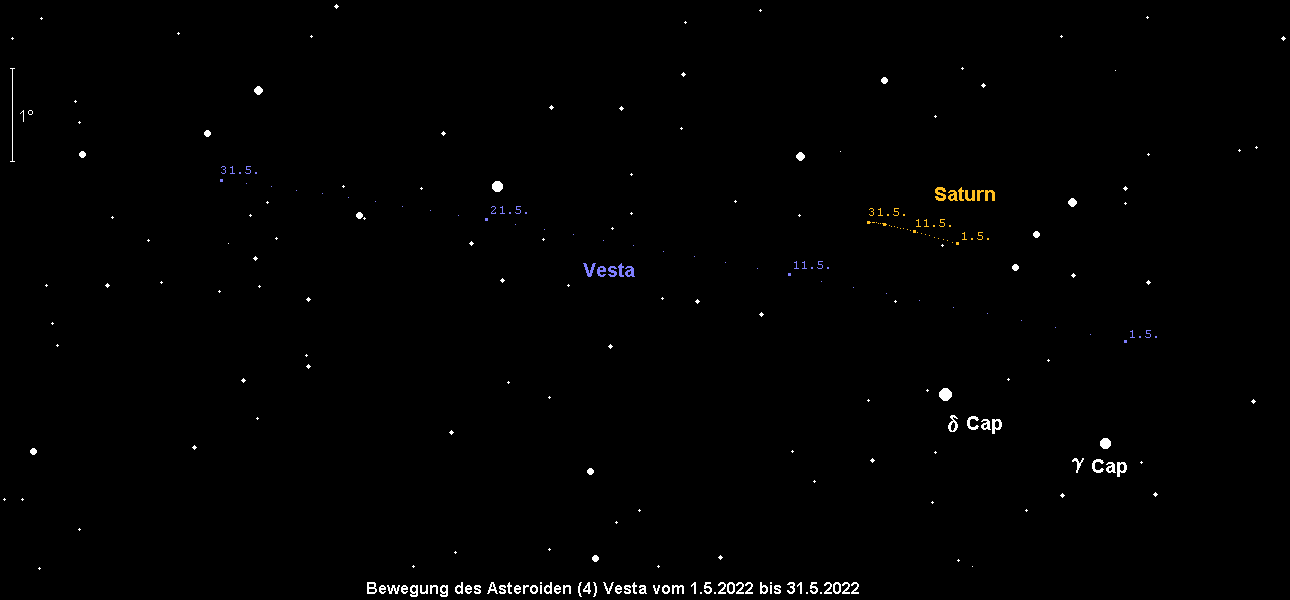 kann bereits beobachtet werden, obwohl sie ihre Opposition erst Ende August erreicht. Der Kleinplanet Nr. 4 ist zu Monatsbeginn 7.6m, am Monatsende 7.2m hell. Er bewegt sich rechtläufig vom östlichen Teil des Sternbilds Steinbock in das Sternbild Wassermann. Dabei passiert der Kleinplanet am 7. Mai Saturn in nur 0.7° südlichem Abstand.