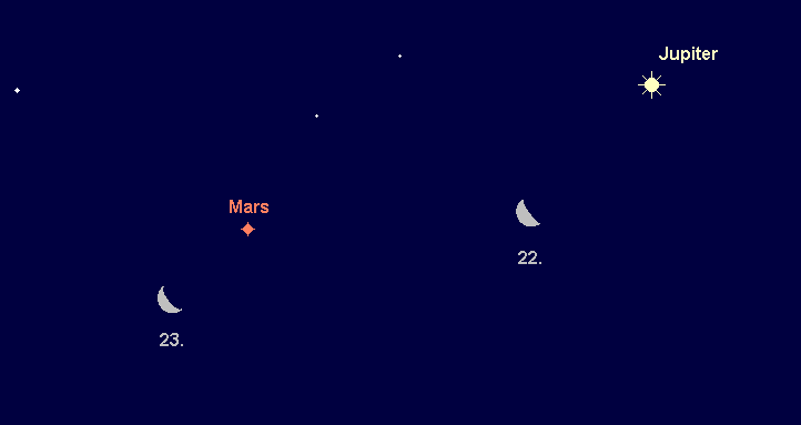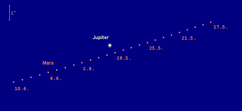 entfernt sich zunehmend von Jupiter und wird zum Planeten der zweiten Nachthälfte. Seine Aufgänge verfrühen sich von 3:15 MESZ auf 2:00 MESZ. Der Rote Planet wandert durch das Sternbild Widder, wobei er vom 3. bis zum 9. Juni durch die Nordwestecke des Sternbilds Walfisch läuft. Seine Helligkeit steigt von 0.7m auf 0.5m an. Am Morgen des 23. Juni sehen wir die Mondsichel 3.5° links unterhalb von Mars. Im Teleskop sind noch immer kaum Details erkennbar, erreicht das Marsscheibchen Ende Juni doch lediglich einen scheinbaren Durchmesser von 7“.