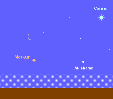 beendet am 3. Juni seine rückläufige Bewegung und bewegt sich danach rechtläufig durch das Sternbild Stier. Bereits am 16. Juni erreicht er mit 23° seine größte westliche Elongation. Dennoch dürften selbst Spezialisten größere Schwierigkeiten haben, den flinken Planeten knapp über dem stark aufgehellten morgendlichen Nordosthorizont ausmachen zu können. Die besten Chancen ergeben sich in der letzten Junidekade kurz nach 4:45 MESZ. Am 27. Juni befindet sich die schmale Mondsichel 4° oberhalb von Merkur.