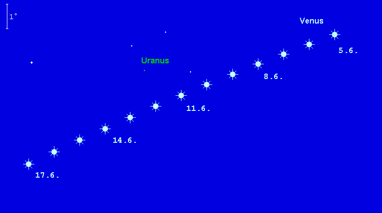 kann von Spezialisten um den 20. Juni erstmals im Fernglas ausgemacht werden. Eventuell gelingt bereits eine teleskopische Beobachtung der Konjunktion mit der Venus am 11. Juni, doch dürfte diese eine Herausforderung darstellen. Nach dem 5.8m hellen Planeten, der sich im Sternbild Widder befindet, sollte in der letzten Junidekade mit dem Fernglas am besten zwischen 3:45 MESZ und 4:00 MESZ gesucht werden.