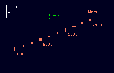 bewegt sich rechtläufig durch das Sternbild Widder und tritt am 9. August in das Sternbild Stier. Zum Monatsende steht er nahe dem „Tor der Ekliptik“, also zwischen den Sternhaufen Hyaden und Plejaden. Im Monatsverlauf steigert Mars seine Helligkeit von 0.2m auf –0.1m. Seine Aufgänge verfrühen sich von 0:30 MESZ auf 23:15 MESZ, so dass er zum Monatsende bereits vor Mitternacht sichtbar wird. Am 1. August wandert Mars in 1.3° südlichem Abstand an Uranus vorüber. Am 19. August sieht man den abnehmenden Halbmond 4° rechts oberhalb des Roten Planeten. Gegen Monatsende erreicht der Durchmesser des Marsscheibchens 9.5“, womit erste Details im Teleskop sichtbar werden. Dabei präsentiert sich das Scheibchen mit einer erkennbaren Phase – nur 85% sind beleuchtet.