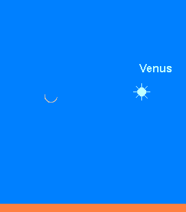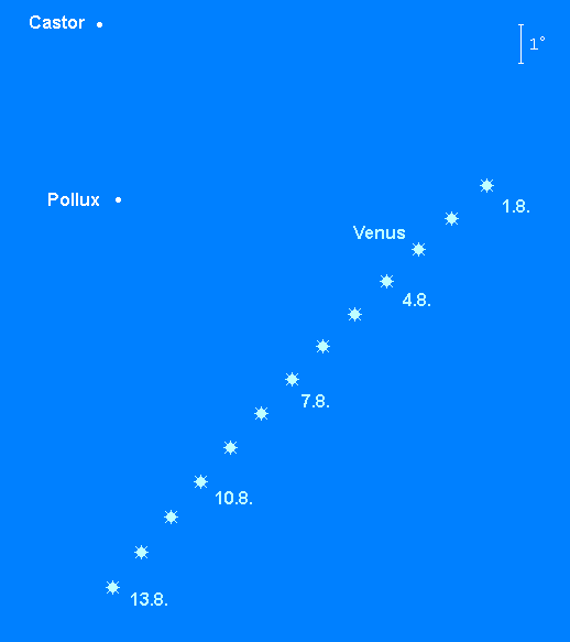 verschlechtert ihre Sichtbarkeit am Morgenhimmel im Monatsverlauf drastisch. Geht der –3.9m helle Planet zu Monatsbeginn um 4:00 MESZ auf, so überschreitet er am Monatsende die Horizontlinie erst um 5:15 MESZ. Entsprechend sinkt Venus dem Horizont stetig näher. Ihr Weg führt sie durch die Sternbilder Zwillinge und Krebs. Am 7. August wandert Venus 7° südlich an Pollux vorüber, und steht am 12. August in der Verlängerung der Linie Castor – Pollux. Am Morgen des 26. August findet man die schmale Mondsichel 4.5° links der Venus. Im Teleskop präsentiert sich der Morgenstern sehr unspektakulär als „Vollvenus“. Zur Monatsmitte zeigt er ein 10.5“ großes, zu 95% beleuchtetes Scheibchen.