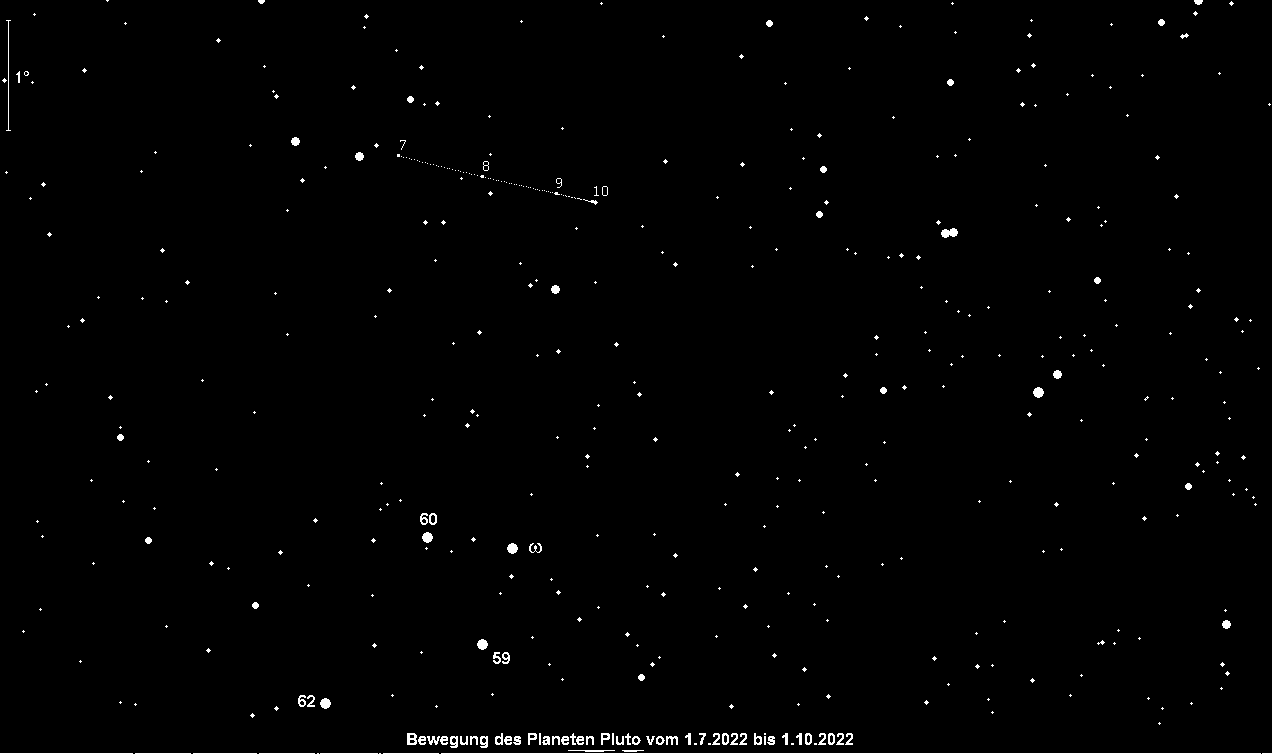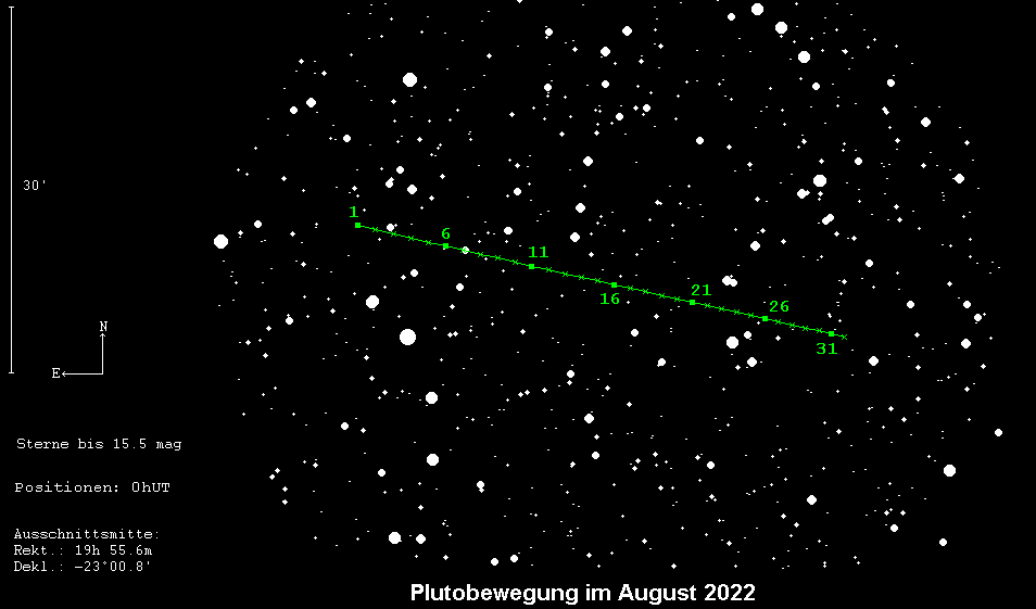 stand Ende Juli in Opposition zur Sonne, und ist auch im August ein optimal beobachtbares Objekt. Allerdings steht der 14.3m helle Zwergplanet im Sternbild Schütze und erreicht nur geringe Höhen. Daher ist er selbst in einem 30cm-Teleskop kein leichtes Objekt. Bei der Identifikation sollen die drei Aufsuchkarten behilflich sein. Die dritte Karte zeigt dabei Sterne bis 15.5m. Die beste Beobachtungszeit ergibt sich bei der Kulmination, die Mitte August kurz vor Mitternacht stattfindet.