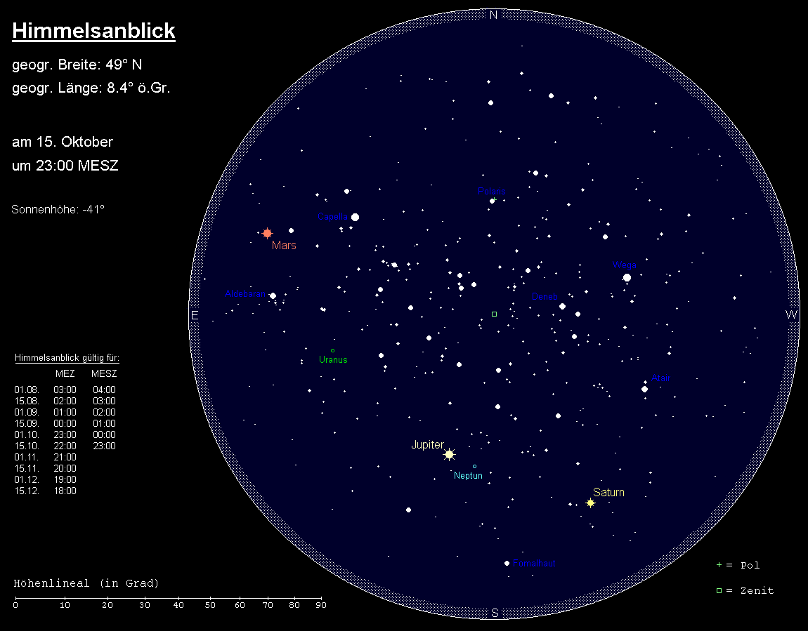 wird am 23. Oktober stationär und bewegt sich anschließend wieder rechtläufig durch den Ostteil des Sternbilds Steinbock. Somit ist seine Oppositionsperiode beendet. Seine Helligkeit geht von 0.5m auf 0.7m zurück. Seine Untergänge verlagern sich im Monatsverlauf von 2:45 MESZ auf 23:45 MEZ. Am frühen Abend des 5. Oktober findet man den zunehmenden Mond 5° unterhalb des Ringplaneten. Trotz der vergleichsweise geringen Horizonthöhen lohnt sich auch im Oktober ein teleskopischer Blick auf Saturn. Im Teleskop präsentiert er ein etwa 17.7“ großes, ovales Planetenscheibchen und einen um 15° gegen die Erde geöffneten Ring mit einem Längsdurchmesser von etwa 40.0“ und einem Querdurchmesser von 10.6“, wobei wir auf die Nordseite blicken. Die fünf hellsten Saturnmonde können bereits in kleineren Instrumenten ausgemacht werden (von außen nach innen): Titan (8.5m hell), Rhea (9.9m), Dione (10.6m) und Tethys (10.4m). Japetus, der fünfte hellere aber nur in westlichen Elongationen gut erkennbare Mond kann im Oktober als 10.6m helles Objekt in weiterer Distanz westlich von Saturn ausgemacht werden.