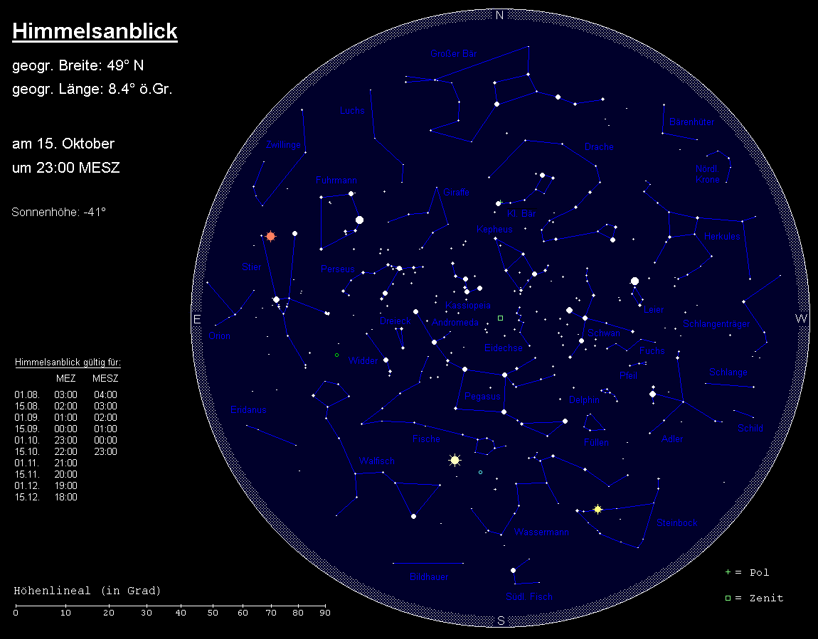 Tief über dem Südhorizont kann ein hellerer Stern gesichtet werden. Es ist Fomalhaut, der Hauptstern des Sternbilds Südlicher Fisch und gleichzeitig der südlichste von unseren Breiten aus sichtbare Stern 1. Größenklasse. Östlich des Meridians, aber ähnlich knapp über dem Horizont ist das bei uns kaum auszumachende Sternbild Bildhauer zu finden. Den Meridian passieren in größerer Höhe der Ostteil des ausgedehnten, aber wenig auffälligen Sternbilds Wassermann und das markante Sternbild Pegasus, auch Herbst-Viereck genannt. Es wird gerne als Pendant des Sommerdreiecks bezeichnet.