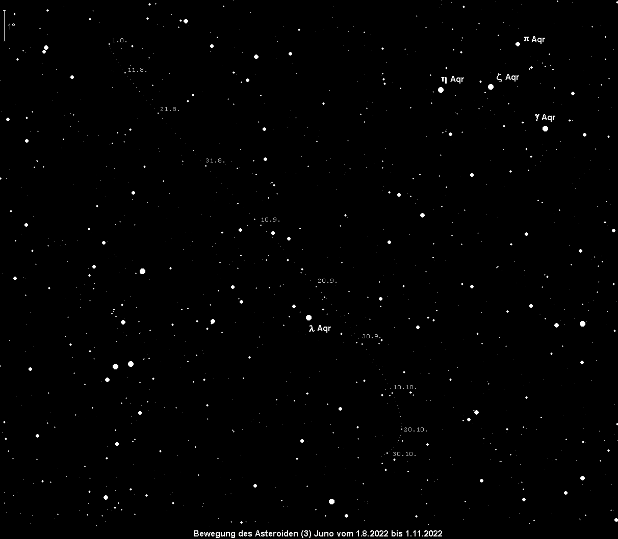 wird am 19. Oktober stationär und bewegt sich anschließend rechtläufig durch das Sternbild Wassermann in südöstlicher Richtung. Die Helligkeit des Kleinplaneten Nr. 3 geht im Monatsverlauf von 8.3m auf 8.8m zurück, so dass Juno Ende Oktober aufgrund ihrer südlichen Deklination kein lohnendes Beobachtungsobjekt mehr sein wird. Die beste Beobachtungszeit ergibt sich nahe der Kulmination. Diese findet zu Monatsbeginn um 23:30 MESZ, am Monatsende um 20:30 MEZ statt.
