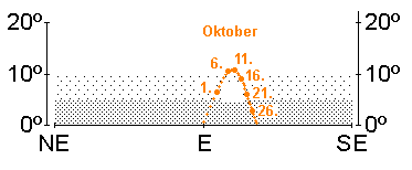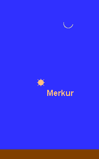 zeigt im Oktober die beste Morgensichtbarkeit des Jahres. Er wird am 1. Oktober stationär und bewegt sich anschließend rechtläufig durch das Sternbild Jungfrau. An diesem Tag kann der erst 1.4m helle Planet gegen 7:00 MESZ eventuell bereits von Spezialisten knapp über dem östlichen Horizont ausgemacht werden. In den folgenden Tagen steigen seine Helligkeit und seine Horizonthöhen rasch an. Am 4. Oktober ist er bereits 0.3m hell und somit bei guter Horizontsicht kein allzu schwieriges Objekt. Im Teleskop kann eventuell die zu 25% beleuchtete, 8.1“ große Sichel ausgemacht werden, die in den folgenden Tagen rasch kleiner und voller wird. Die größte westliche Elongation mit 18° wird am 8. Oktober erreicht. An diesem Tag ist Merkur –0.5m hell und gegen 7:00 MESZ optimal beobachtbar. Bis zum 16. Oktober nimmt die Helligkeit auf –1.0m zu, und Merkur bleibt gut sichtbar. Danach wird es zunehmend schwieriger, den flinken Planeten auszumachen. Am Morgen des 24. Oktober kann die schmale Mondsichel bei der Identifikation behilflich sein, die man 4.5° oberhalb von Merkur findet. In den Folgetagen endet die Sichtbarkeit (beste Beobachtungszeit: 7:30 MESZ), wobei es Spezialisten gelingen mag, ihn noch bis zum Monatsende knapp über dem östlichen Horizont auszumachen.