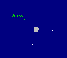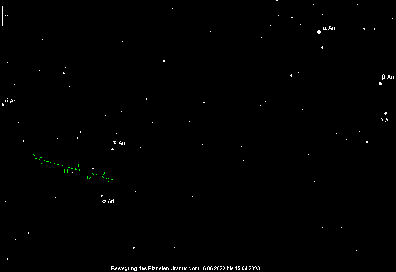 bewegt sich rückläufig durch den südöstlichen Teil des Sternbilds Widder, leider weitab markanter Sterne. Der 5.7m helle Planet wird in der zweiten Monatshälfte zum Objekt der ganzen Nacht. Seine Aufgänge verlagern sich von 20:15 MESZ auf 17:15 MEZ, die Kulmination von 3:45 MESZ auf 0:45 MEZ. Etwa eine Stunde nach dem Aufgang kann er mit Aussicht auf Erfolg aufgesucht werden. Bei Dämmerungsbeginn am 12. Oktober steht der Mond nur 1.8° rechts unterhalb von Uranus. Im Teleskop zeigt sich das grünliche, 3.7" große Uranusscheibchen ab etwa 100-facher Vergrößerung.
