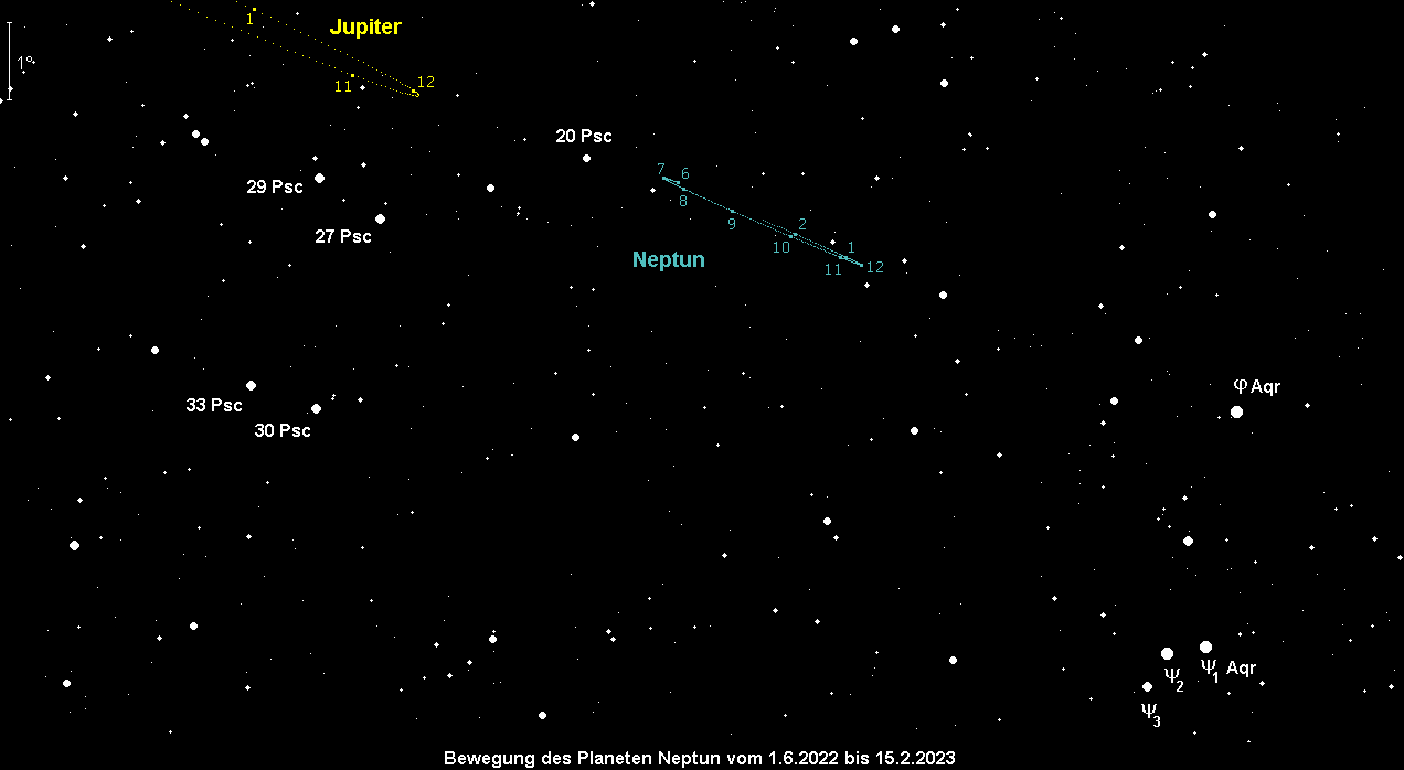 stand Mitte September in Opposition zur Sonne und ist damit im Oktober optimal beobachtbar. Der 7.8m helle Planet ist ein einfaches Fernglasobjekt im Sternbild Wassermann – nahe der Grenze zum Sternbild Fische. Am besten beobachtet man ihn nahe der Kulmination. Diese erfolgt zu Monatsbeginn gegen 0:15 MESZ, am Monatsende gegen 21:15 MEZ. In der Nacht vom 7. auf den 8. Oktober passiert der fast volle Mond Neptun, was Beobachtungen des fernsten Großplaneten stark erschwert. Im Teleskop weist Neptun ein grünblaues Scheibchen mit einem Durchmesser von 2.4“ auf. Mit mittelgroßen Instrumenten kann auch sein größter Mond, Triton (13.4m hell) gesichtet werden, der sich nie mehr als 16“ von Neptun entfernt.