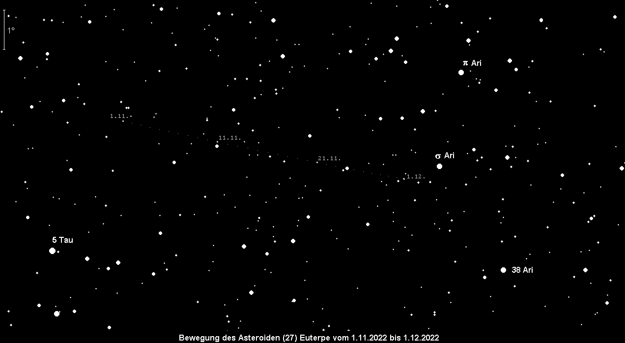 erreicht am 13. November eine sehr günstige Opposition im südöstlichen Teil des Sternbilds Widder. Kleinplanet Nr. 27 wird an diesem Tag immerhin 8.7m hell sein. Zu Monatsbeginn und -ende wird ihre Helligkeit lediglich 9.3m betragen. Am letzten Novembertag steht sie nur 1.5° südlich von Uranus. Die beste Beobachtungszeit ergibt sich um Mitternacht.