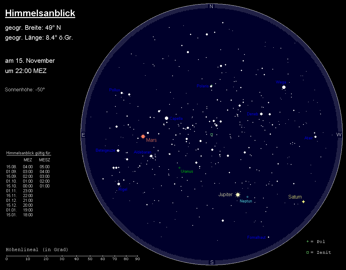 wird am 24. November stationär und bewegt sich anschließend rechtläufig durch das Sternbild Fische. Er hat damit seine Oppositionsperiode beendet, was auch an der abnehmenden Helligkeit erkennbar ist, die im Monatsverlauf von –2.8m auf –2.6m sinkt. Jupiters Untergänge verschieben sich von 3:30 MEZ auf 1:30 MEZ. Am Abend des 4. November befindet sich der Vollmond 3.5° unterhalb des Gasplaneten. Noch immer ist Jupiter ein lohnendes teleskopisches Objekt, auch wenn sein Äquatordurchmesser von 47.7“ auf 43.6“ zurückgeht. Zu nennen sind hier die dynamischen Atmosphärenstrukturen wie auch das Wechselspiel der vier hellsten Monde samt Bedeckungen und Verfinsterungen durch Jupiter oder Schattenvorübergängen vor der Jupiterscheibe.