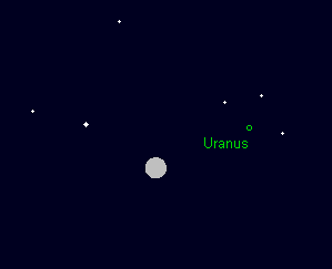 steht am 9. November in Opposition zur Sonne. Damit geht er bei Sonnenuntergang auf, kulminiert gegen 0:30 MEZ im Süden und geht bei Sonnenaufgang unter. Der 5.6m helle Planet bewegt sich rückläufig durch den südöstlichen Teil des Sternbilds Widder, leider weitab markanter Sterne. Dennoch kann man versuchen, den sechsten Großplaneten unter dunklem Himmel auch mit dem bloßen Auge zu entdecken, wobei die relative Sternarmut sogar von Vorteil ist. Am frühen Abend des 8. November steht der Vollmond 2.5° links unterhalb von Uranus. Im Teleskop zeigt sich das grünliche, 3.8“ große Uranusscheibchen ab etwa 100-facher Vergrößerung deutlich. Besitzer mittelgroßer Instrumente können sich auch an den größten Uranusmonden Titania (13.8m) und Oberon (14.1m) versuchen, die sich nie weiter als etwa 30“ bzw. 40“ vom Uranusscheibchen entfernen.