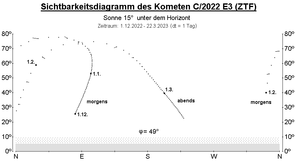 Im Winter 2022/23 kann der Komet C/2022 E3 (ZTF) mit kleineren Instrumenten bzw. im Fernglas beobachtet werden. Er wird die Erde am 2. Februar 2023 in 0.28 AE passieren und sollte dann 4.5m hell sein. Details finden sich in der AVKa-Schnellmitteilung Nr. 109.