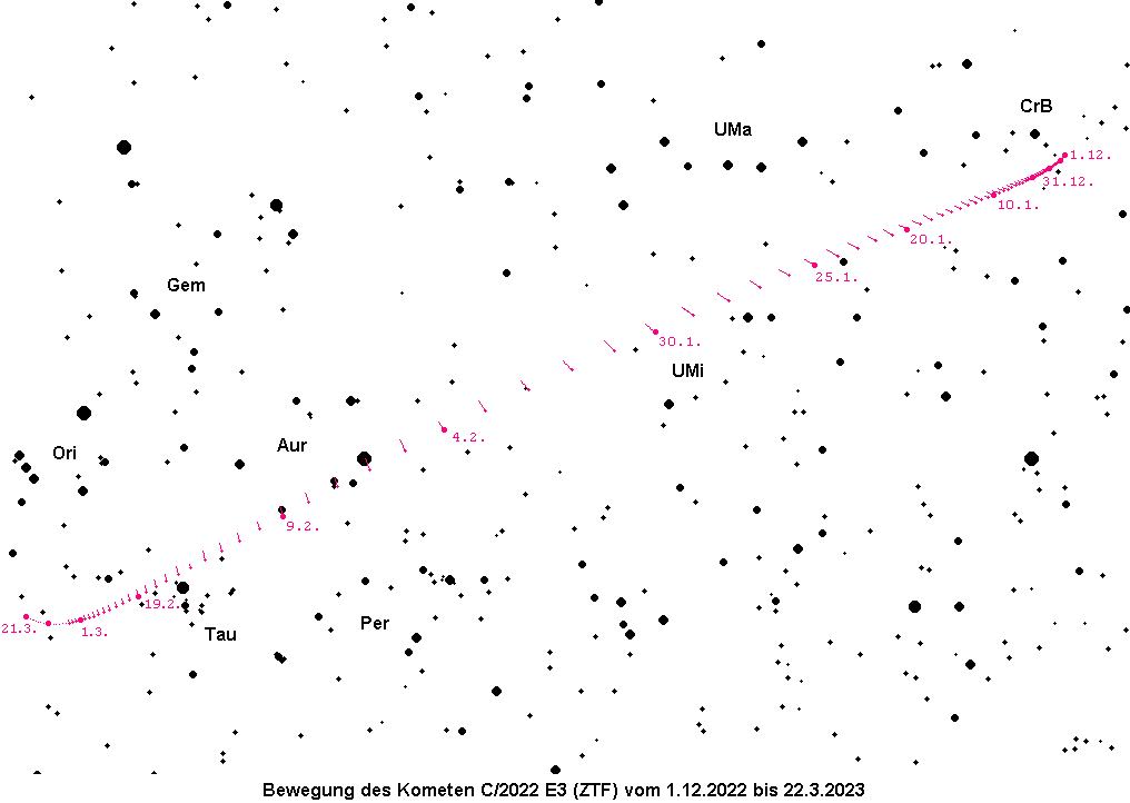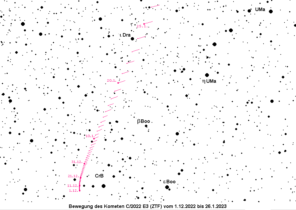 Der Komet C/2022 E3 (ZTF) erreicht Ende Januar seine größte Helligkeit von etwa 4.5m, so dass er möglicherweise sogar mit dem bloßen Auge sichtbar sein wird. Da die Koma aufgrund der großen Erdnähe allerdings knapp vollmondgroß sein dürfte, wird er nur einen geringen Kontrast zum Himmelshintergrund aufweisen. Der Komet erreicht hohe Deklinationen bei seinem Weg vom Sternbild Nördliche Krone bis in die Giraffe. Er ist zunächst ein Morgenhimmelobjekt, kann aber ab der zweiten Januarhälfte auch bereits am späteren Abendhimmel beobachtet werden. Details entnehme man der AVKa-Schnellmitteilung Nr. 109.