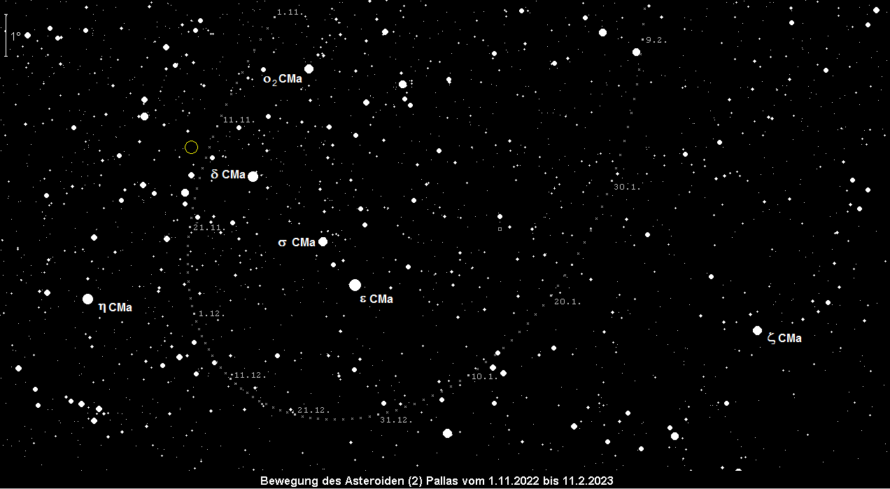 steht am 8. Januar in Opposition zur Sonne und erreicht dabei eine maximale Helligkeit von 7.6m. Leider bewegt sich Kleinplanet Nr. 2 im südwestlichen Teil des Sternbilds Großer Hund, bei Deklinationen von anfangs –32° und ist daher im Fernglas ein schwieriges Objekt. Glücklicherweise bewegt sich Pallas steil nach Norden und erreicht zum Monatsende Deklinationen von immerhin –26°. Der Meridiandurchgang findet zu Monatsbeginn um 0:30 MEZ statt, am Monatsende um 22:30 MEZ.