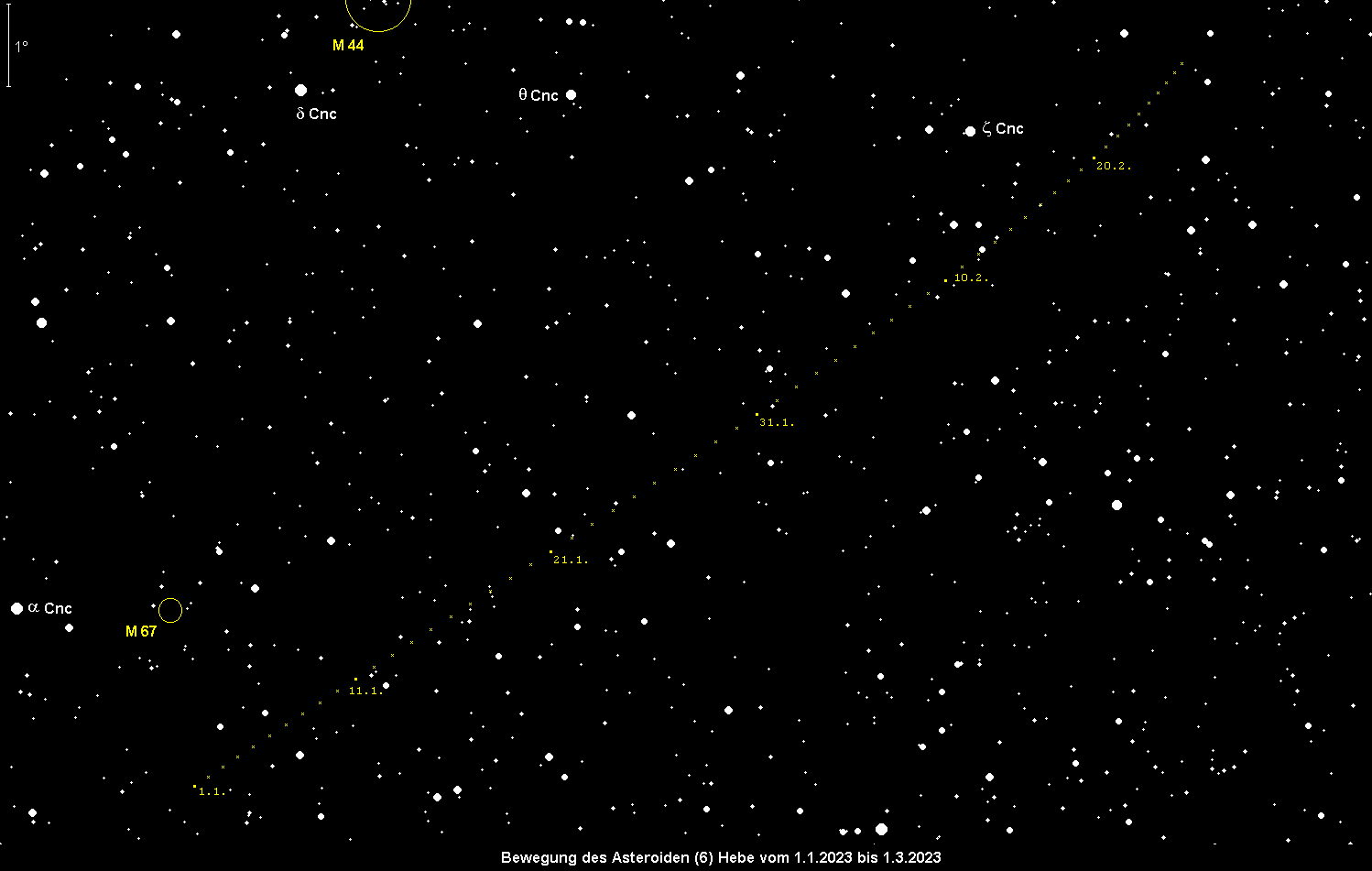 steht am 26. Januar in einer vergleichsweise günstigen Opposition und wird dabei 8.8m hell, so dass sie im Fernglas gesichtet werden kann. Kleinplanet Nr. 6 bewegt sich rückläufig im Sternbild Krebs in nordwestlicher Richtung. Ihre Kulminationszeiten verlagern sich im Monatsverlauf von 2:30 MEZ auf 0:00 MEZ, doch steht der Kleinplanet auch schon am späteren Abend in günstiger Höhe.