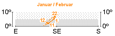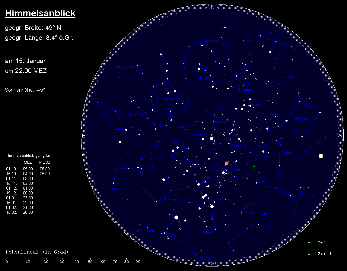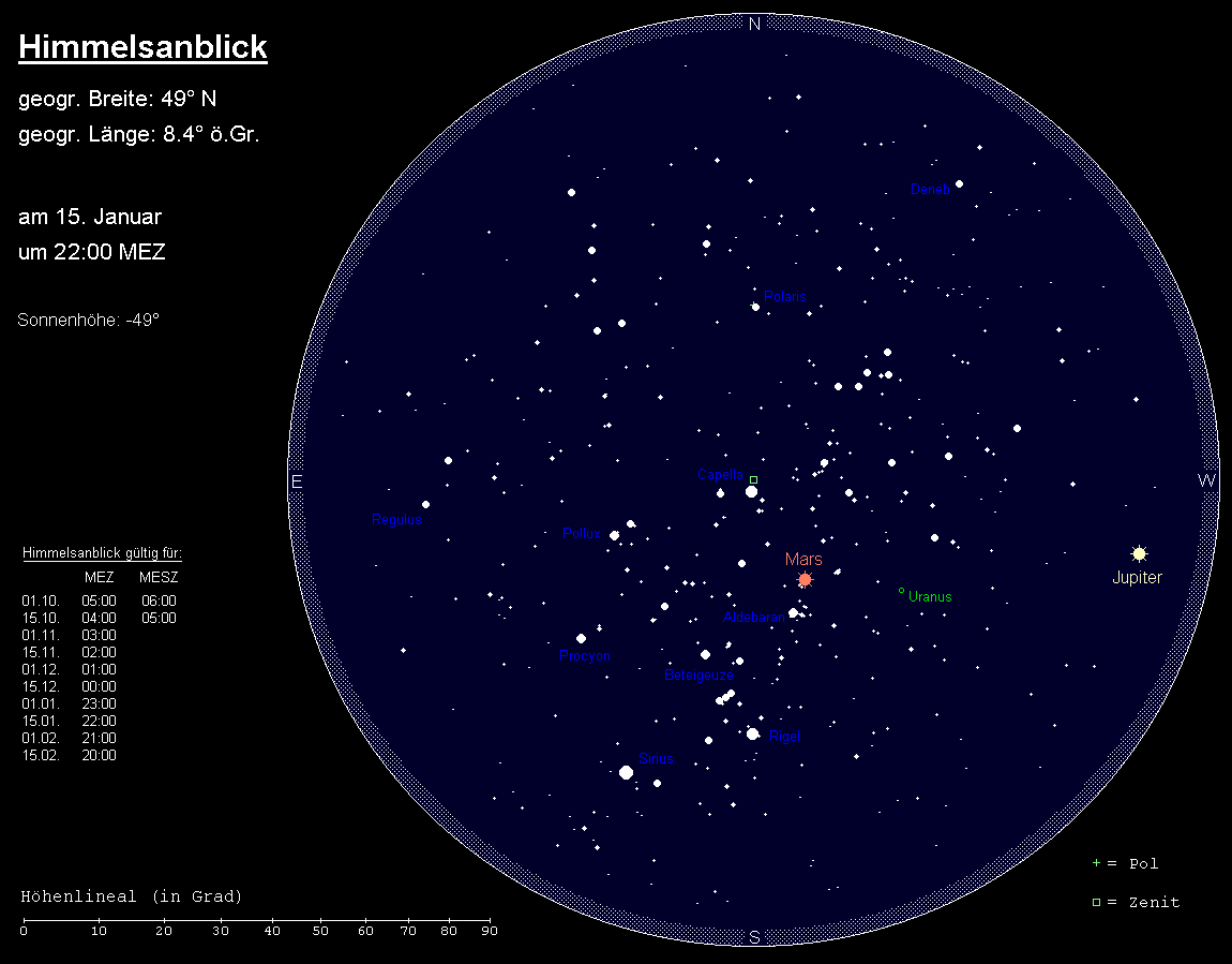 Der Helligkeitsschwerpunkt befindet sich im Januar im Süden. Halbhoch steht hier das auffälligste Wintersternbild, der Orion mit der orangefarbenen Beteigeuze und dem blauen Rigel sowie dem im Fernglas gut erkennbaren Orionnebel südlich der Gürtelsterne. Oberhalb finden wir das Sternbild Stier mit dem orangefarbenen Aldebaran und seinen zwei Sternhaufen Hyaden (um Aldebaran) und Plejaden (nordwestlich von Aldebaran), auch Siebengestirn genannt. Aktuell wird diese interessante Sternkulisse noch zusätzlich durch den auffallenden Mars bereichert. Über unseren Köpfen, im Zenit, steht die helle Capella, Hauptstern des Sternbilds Fuhrmann. Nordöstlich des Orions befindet sich das Sternbild Zwillinge mit Castor und Pollux und unterhalb der Zwillinge das Sternbild Kleiner Hund mit dem hellen Procyon. Südöstlich des Orions strahlt Sirius im Sternbild Großer Hund, der hellste Stern am irdischen Himmel. Das Wintersechseck, gebildet aus den Sternen Capella, Pollux, Procyon, Sirius, Rigel und Aldebaran, zieht somit im Süden alle Blicke auf sich.