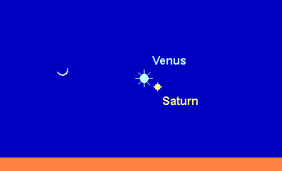 steht in geringer Höhe über dem abendlichen Südwesthorizont. Der –3.9m helle Planet wandert durch das Sternbild Steinbock und tritt am 24. Januar in das Sternbild Wassermann. Geht die Venus am Monatsanfang bereits um 17:45 MEZ unter, so verschieben sich die Untergänge bis zum Monatsende auf 19:15 MEZ. Am 22. Januar passiert Venus den Ringplaneten Saturn in lediglich 0.4° südlichem Abstand. Diese recht enge Konjunktion kann am besten im Fernglas betrachtet werden, da Saturn zu diesem Zeitpunkt kaum noch mit dem bloßen Auge erkennbar ist. Am folgenden Abend kann man die schmale Mondsichel nur 4.5° links von der Venus finden, deren Abstand von Saturn an diesem Abend bereits auf 1° angewachsen ist. Das Dreigestirn kann am besten gegen 18:00 MEZ gesichtet werden. Im Teleskop zeigt die Venus lediglich ein 11“ großes, mit 95% fast voll beleuchtetes Scheibchen.