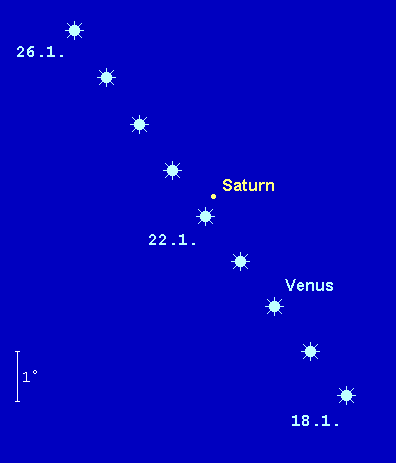 kann zu Monatsbeginn noch bequem über dem südwestlichen Abendhorizont gesehen werden, doch verschlechtern sich die Sichtbedingungen mit jeder Woche deutlich. Nach dem 25. Januar dürfte er nur noch von Spezialisten ausgemacht werden können. Der im Sternbild Steinbock, nahe der Grenze zum Sternbild Wassermann, positionierte, 0.9m helle Ringplanet sinkt zu Monatsbeginn um 20:00 MEZ, am Monatsende bereits um 18:15 unter die Horizontlinie. Am 22. Januar passiert Venus den Ringplaneten 0.4° südlich, wozu möglicherweise ein Fernglas erforderlich ist. Am folgenden Abend steht die schmale Mondsichel 7° links von Saturn. Sinnvolle teleskopische Beobachtungen dürften nicht mehr gelingen.