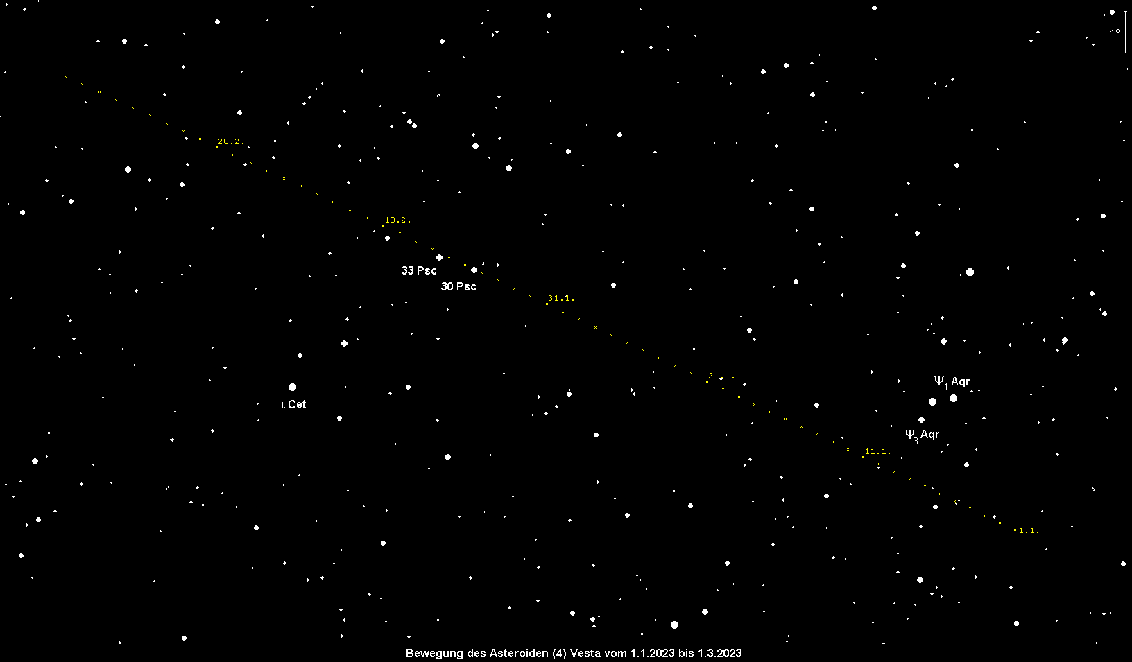 bewegt sich rechtläufig durch das Sternbild Wassermann und kann in geringer Höhe über dem abendlichen Südwesthorizont mit dem Fernglas gesichtet werden. Die Helligkeit von Kleinplanet Nr. 4 geht leicht von 8.1m auf 8.3m zurück. Die beste Beobachtungszeit ergibt sich gleich nach Dämmerungsende.