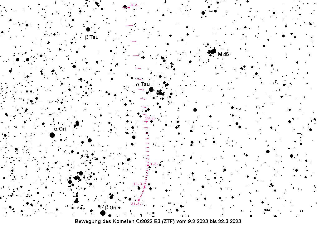 Am 2. Februar passiert der Komet C/2022 E3 (ZTF) die Erde im Abstand von lediglich 0.28 AE und sollte zu diesem Zeitpunkt seine maximale Helligkeit von etwa 4.5-5.0m erreichen. Danach wird er rasch schwächer und weist zum Monatsende nur noch die 8. Größenklasse auf. Er bewegt sich durch die Sternbilder Giraffe, Fuhrmann und Stier, ist somit ein bequemes Objekt am Abendhimmel. Am Abend des 5. Februar steht er nahe Capella und am Abend des 14. Februar nahe Aldebaran. Details entnehme man der AVKa-Schnellmitteilung Nr. 109.