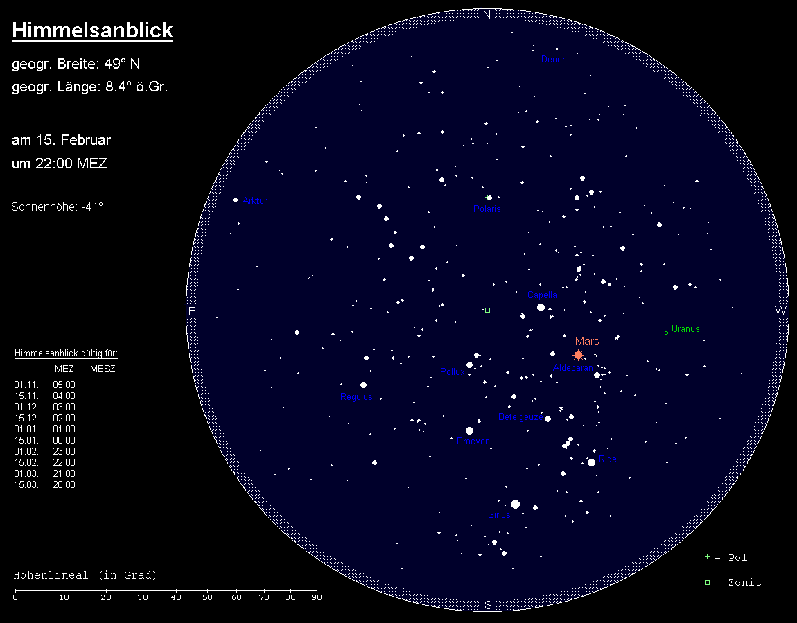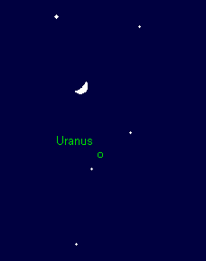 wandert langsam rechtläufig durch den Südostteil des Sternbilds Widder. Die beste Beobachtungszeit des 5.8m hellen Planeten ergibt sich gleich nach Dämmerungsende. Seine Untergänge verlagern sich von 1:45 MEZ auf 0:00 MEZ, wobei Uranus etwa eine Stunde zuvor in den horizontnahen Dunstschichten unsichtbar wird. Am frühen Abend des 25. Februars findet man den kurz vor dem Ersten Viertel stehenden Mond knapp 3° links oberhalb von Uranus. Teleskopische Beobachtungen zeigen ein 3.6“ großes Scheibchen ab etwa 100-facher Vergrößerung. Mit größeren Teleskopen können auch die Uranusmonde Titania (14.0m) und Oberon (14.2m) gesichtet werden.