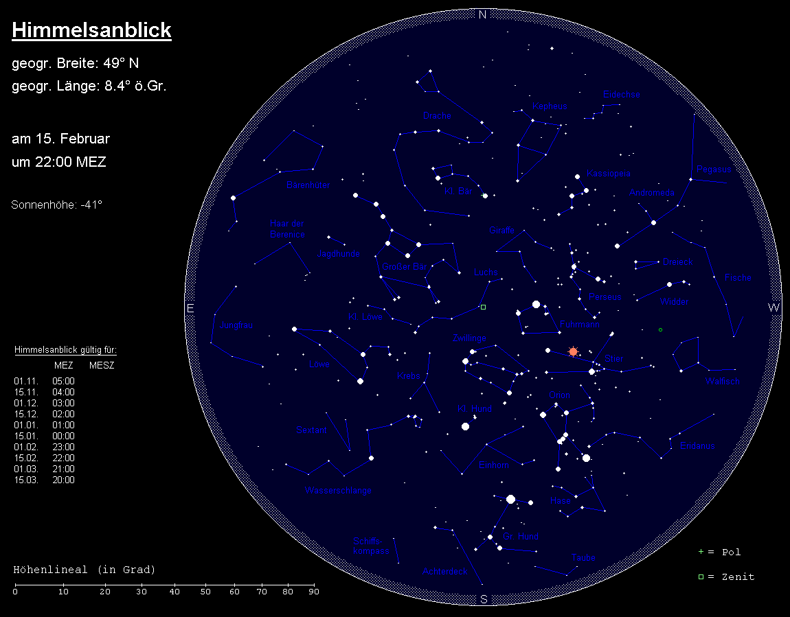Im Südwesten ist der Walfisch größtenteils unter dem Horizont verschwunden, und das Sternbild Eridanus ist ebenfalls bereits zu größeren Teilen untergegangen.