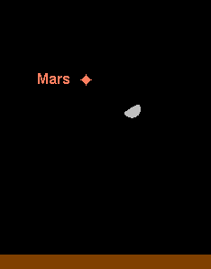 ist weiter ein auffälliges Objekt am Nachthimmel, wenn er auch stetig schwächer wird. Die Helligkeit sinkt von –0.3m auf 0.4m ab. Sein Untergang verfrüht sich im Monatsverlauf von 4:15 MEZ auf 3:15 MEZ. Mars läuft rechtläufig durch das Sternbild Stier und passiert am 5. Februar den Hauptstern Aldebaran in 8° nördlichem Abstand. Am Morgen des 28. Februar findet man den Mond kurz vor seinem Untergang 1.8° rechts unterhalb des Roten Planeten. Durch die zunehmende Entfernung zwischen Erde und Mars schrumpft der Durchmesser des Planetenscheibchens von 10.7“ auf 8.2“, wobei das Scheibchen zu etwa 91% beleuchtet ist. Somit wird es gegen Monatsende sehr schwierig, detaillierte Beobachtungen der Albedostrukturen durchzuführen.