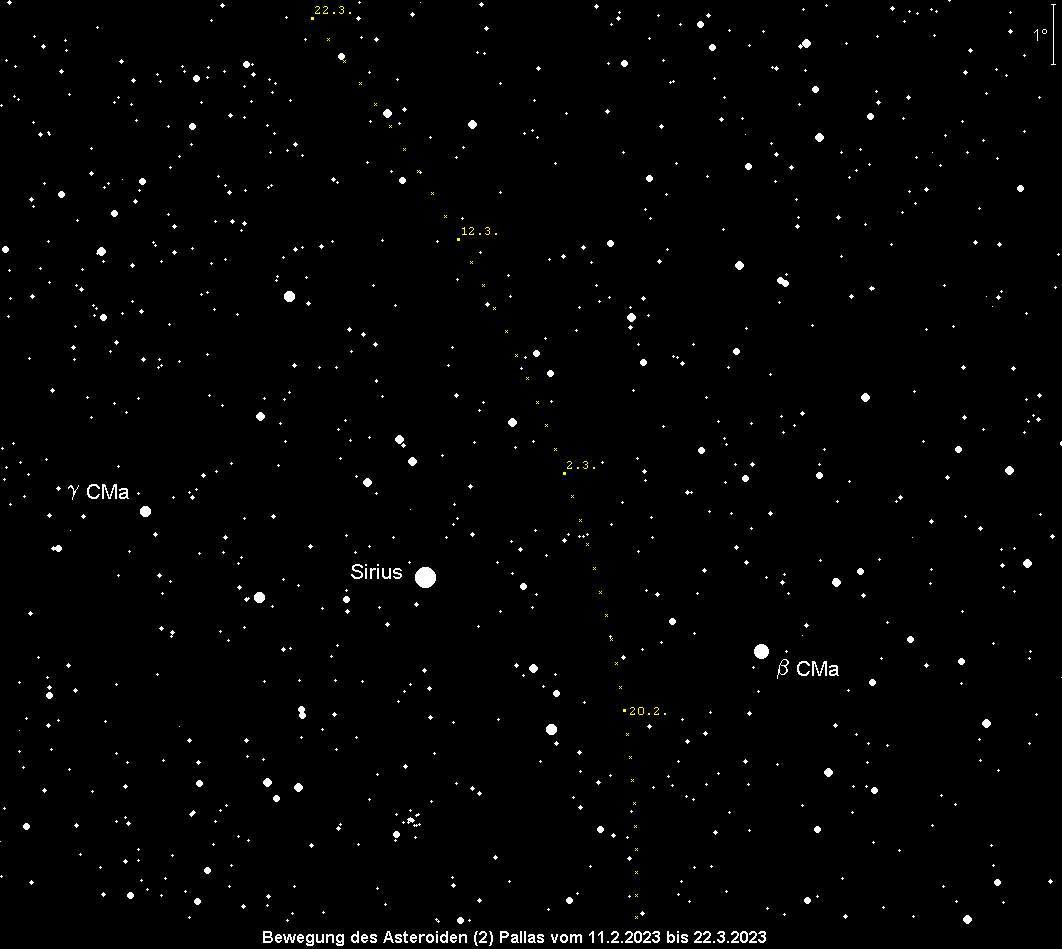 wandert nordwärts durch das Sternbild Großer Hund und passiert gegen Monatsende Sirius im Abstand von etwa 3°. Am 12. Februar wird Kleinplanet Nr. 2 stationär, so dass seine Rektaszensionen wieder zunehmen. Die Helligkeit von Pallas sinkt leicht von 7.7m auf 7.9m, so dass sie weiterhin ein Fernglasobjekt ist. Der Meridiandurchgang findet zu Monatsbeginn um 22:30 MEZ statt, am Monatsende um 20:30 MEZ.