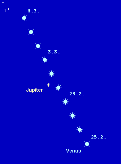 ist der dominierende Planet des frühen Abendhimmels. Sie gewinnt zunehmend an Horizonthöhe. Der –3.9m helle Planet wandert in der ersten Monatshälfte durch das Sternbild Wassermann und in der zweiten durch das Sternbild Fische. Damit nähert sich der Abendstern Jupiter immer mehr an. Am 15. Februar passiert Venus gegen Mittag den fernen Neptun in weniger als 1‘ Abstand. Bis zum Abend ist die Distanz bereits wieder auf 16‘ angewachsen. Neptun kann aufgrund seiner geringen Horizonthöhe und der extremen Helligkeit der Venus allerdings ausschließlich im Teleskop ausgemacht werden. Die Untergänge verlagern sich von 19:15 MEZ auf 20:45 MEZ. Am Abend des 22. Februar steht die schmale Mondsichel zwischen Venus und Jupiter, 4° links oberhalb ersterer. Dieses Dreigestirn wird einen spektakulären Anblick bieten. Am Monatsende trennen Venus und Jupiter nur noch 1.5°. Im Teleskop wächst das Venusscheibchen nur geringfügig von 11“ auf 12“ an, der Beleuchtungsgrad geht von 92% auf 86% zurück.