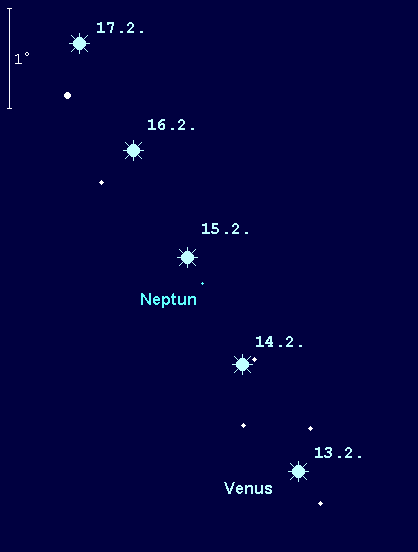 verschwindet zu Monatsbeginn vom Abendhimmel. Spezialisten kann eine Sichtung noch bis um den 15. Februar gelingen. Dabei sollte der 8.0m helle Planet gegen 19:00 MEZ aufgesucht werden, wenn die Dämmerung noch nicht abgeschlossen, der Planet aber noch eine Horizonthöhe von über 10° aufweist. Am Abend des 15. Februars kann die grelle Venus eine Hilfe bei der Identifikation des fernsten Planeten im Teleskop sein.