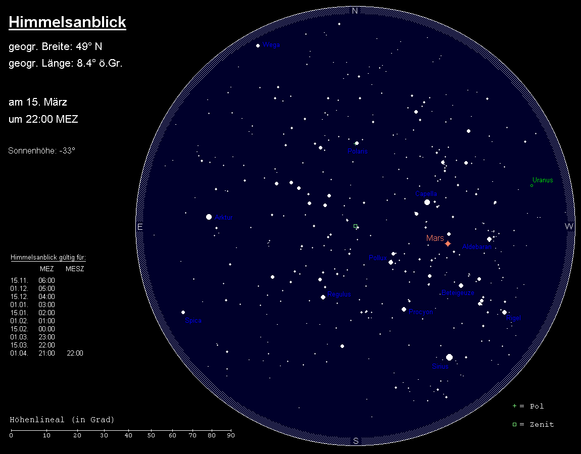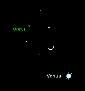 sinkt im Monatsverlauf deutlich dem abendlichen Nordwesthorizont entgegen. Sein Untergang verlagert sich von 0:00 MEZ auf 22:00 MEZ (23:00 MESZ). Eine Stunde zuvor wird er in den horizontnahen Dunstschichten unsichtbar. Der 5.8m helle Planet wandert rechtläufig durch den Südostteil des Sternbilds Widder. Am Abend des 24. März kann die Mondsichel bei der Aufsuche behilflich sein. Sie steht 3° rechts unterhalb des grünlichen Planeten. Teleskopische Beobachtungen lohnen sich nun nicht mehr.
