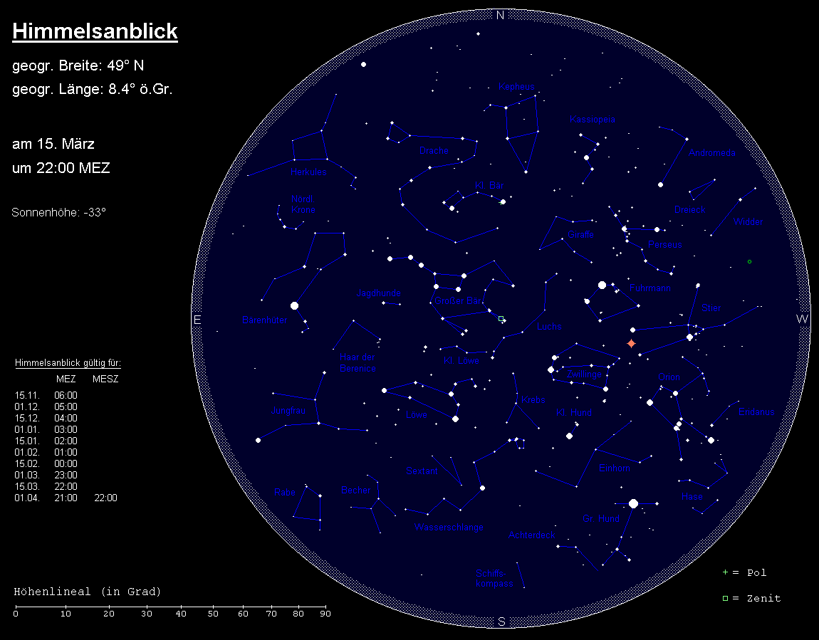 Das Wintersechseck, zusammengesetzt aus den Sternen Capella, Pollux, Procyon, Sirius, Rigel und Aldebaran, ist nun vollständig nach Südwesten gerückt. Das Sternbild Orion hat sich schon deutlich dem Horizont genähert. Ebenso der Stier (in dem sich aktuell der auffällige Mars aufhält) und das Sternbild Großer Hund mit dem hellsten Stern des Himmels, Sirius. Die Sternbilder Hase und Achterdeck befinden sich bereits im Untergang. Hingegen sind die Sternbilder Fuhrmann mit der hellen Capella, Sternbild Zwillinge mit den hellen Sternen Castor und Pollux sowie der Kleine Hund mit Procyon noch in größerer Höhe zu finden. Zwischen Kleinem und Großem Hund ist das schwache Sternbild Einhorn positioniert.
