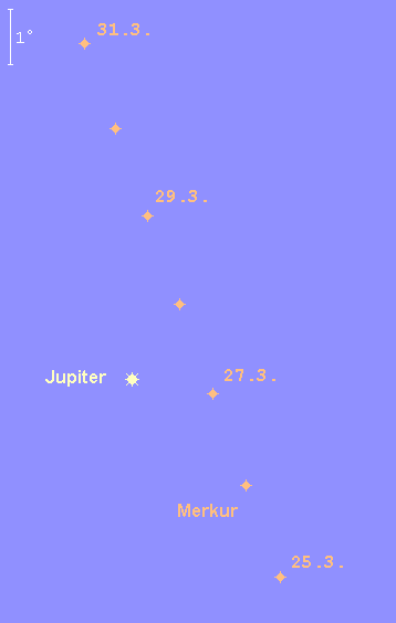 steht am 17. März in oberer Konjunktion mit der Sonne. In der letzten Woche des Monats ist sein Sonnenabstand genügend angewachsen, um ihn in der Abenddämmerung sichtbar werden zu lassen. Spezialisten mag dies bereits am 25. März gelingen. An diesem Tag geht der –1.4m helle Merkur um 19:45 MEZ unter und kann kurz nach 19:00 MEZ tief über dem Westhorizont aufgefunden werden. Am 31. März sollte der dann –1.1m helle Planet ab 20:15 MESZ bereits gut erkennbar sein; sein Untergang erfolgt um 21:00 MESZ. Am 27./28. März begegnet der flinke Planet Jupiter. Diese Konstellation ist aber nur bei guten Bedingungen zu sehen, wobei wohl ein Fernglas zu Hilfe genommen werden muss. Merkur steht nur 1.6° nördlich des Gasplaneten. Beide bewegen sich zu diesem Zeitpunkt im Sternbild Fische.