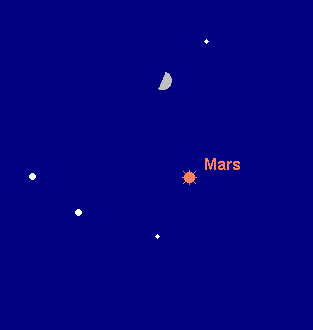 wandert durch den Nordostteil des Sternbilds Stier und tritt am 26. März ins Sternbild Zwillinge. Am 10. März wandert er 3° südlich an Al Nath (beta Tau) vorbei. Seine Helligkeit nimmt weiter ab, und zwar von 0.4m auf 0.9m, so dass er zu Monatsende Aldebaran bezüglich Helligkeit und Farbe stark ähnelt. Die Untergänge verlagern sich von 3:00 MEZ auf 2:15 MEZ (3:15 MESZ). Am frühen Abend des 28. März steht der Mond 3° oberhalb des Roten Planeten. Teleskopisch ist der Planet ziemlich uninteressant geworden. Der Durchmesser des Planetenscheibchens schrumpft von 8.2“ auf 6.4“. Dabei zeigt das Scheibchen eine merkliche Phase. Zum Monatsende ist es nur zu 90% beleuchtet.